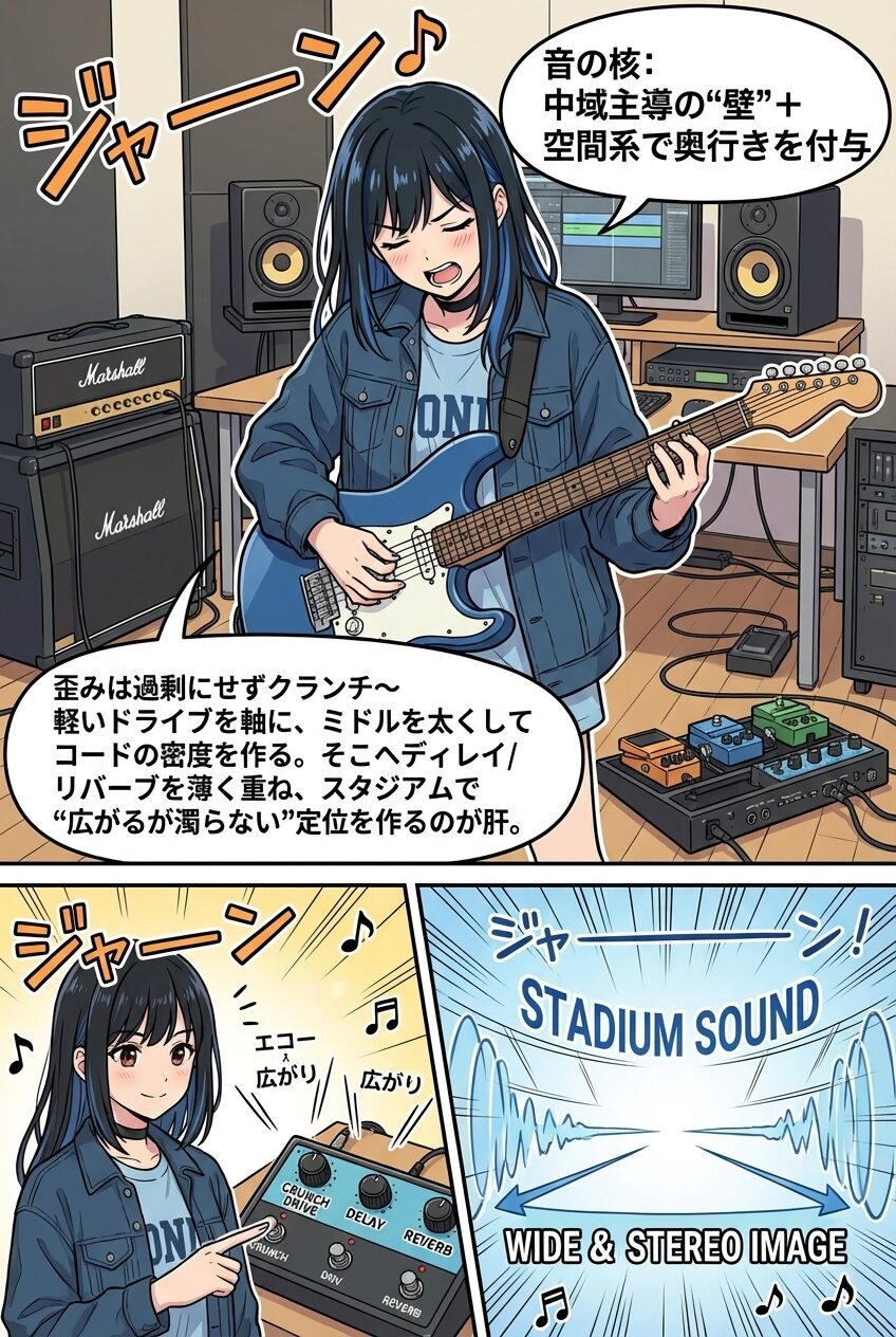 音作りにおけるEQやミックスも重要で、特に「中域重視」と「ダブルトラッキングによる広がり」が特徴です。過剰に低域を盛らず、2〜3kHz付近を軽く持ち上げることで、スタジアム規模でも聴きやすく、ラジオやスマートフォンでも抜ける音像を実現。この設計思想は、ただのギターサウンドを「国民的アンセムの伴奏」に昇華させています。