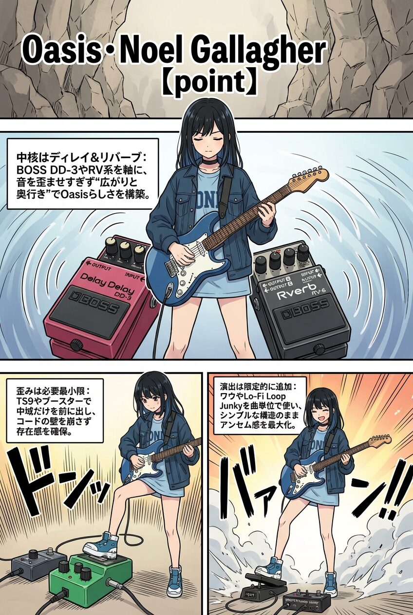 これらの構成から見ても、ノエルのボードは「ディレイとリバーブを軸に、必要最低限のブースターやワウで彩る」というスタイルで一貫しています。過剰に歪ませず、広がりと厚みを前面に出すことが彼の哲学であり、その結果Oasisサウンドは唯一無二の存在感を放つことになったと想定されます。